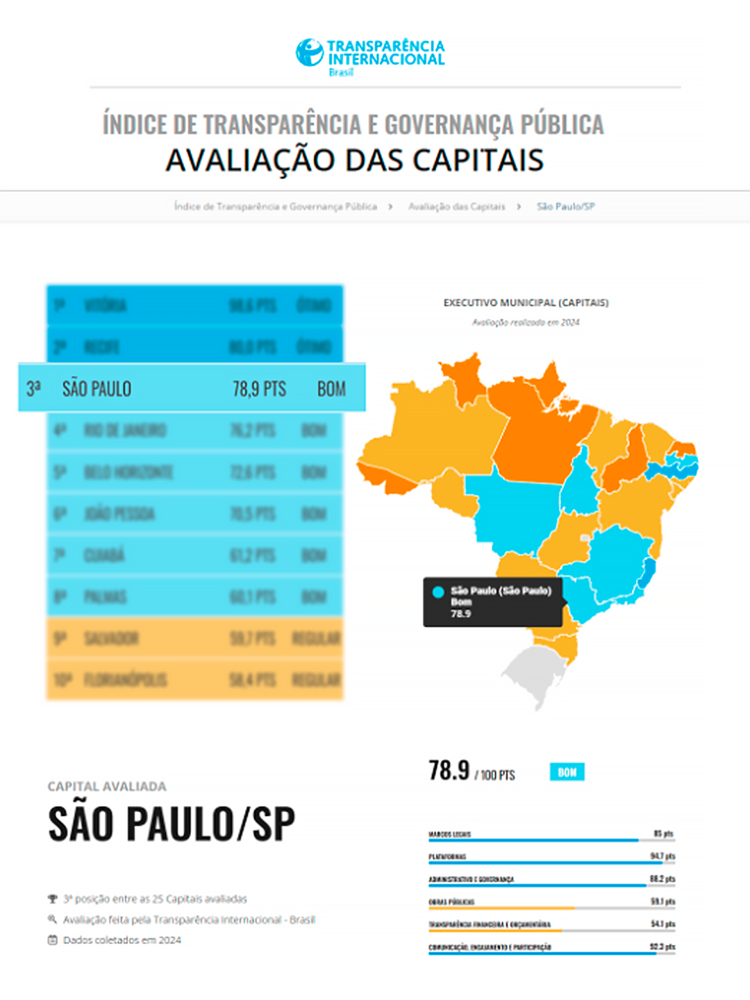 A capital paulista obteve a classificação "boa", com 78,9 pontos em 100 possíveis, superando a média nacional e consolidando-se como referência em práticas de integridade, comunicação pública e governo aberto. Entre os avanços reconhecidos estão a regulamentação da Lei Geral de Proteção de Dados Pessoais (LGPD), a implementação da Lei Anticorrupção e a disponibilização de informações sobre obras públicas municipais.