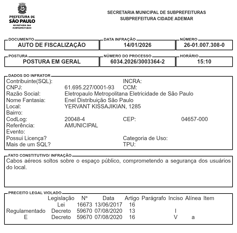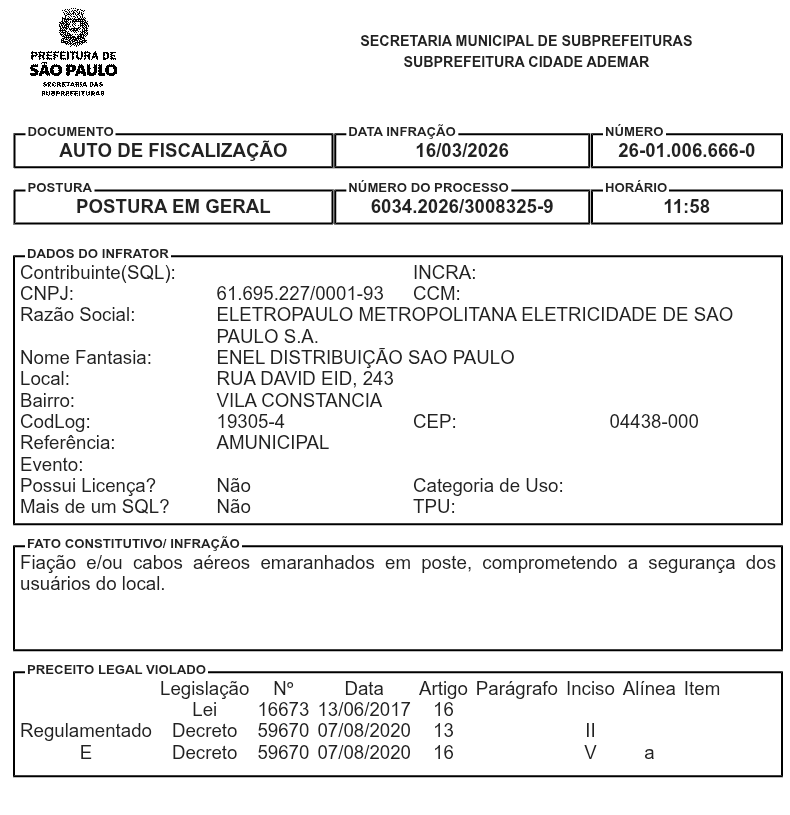 A Subprefeitura Cidade Ademar intensificou as ações de fiscalização contra a fiação irregular nas vias públicas da região. Cabos soltos, pendurados ou sem qualquer tipo de ligação ativa configuram infração, além de representarem riscos à segurança da população e contribuírem para a degradação do espaço urbano.