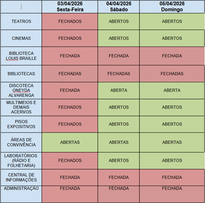 Teatro Flávio Império: Estará aberto todos os dias das 10h às 21h.