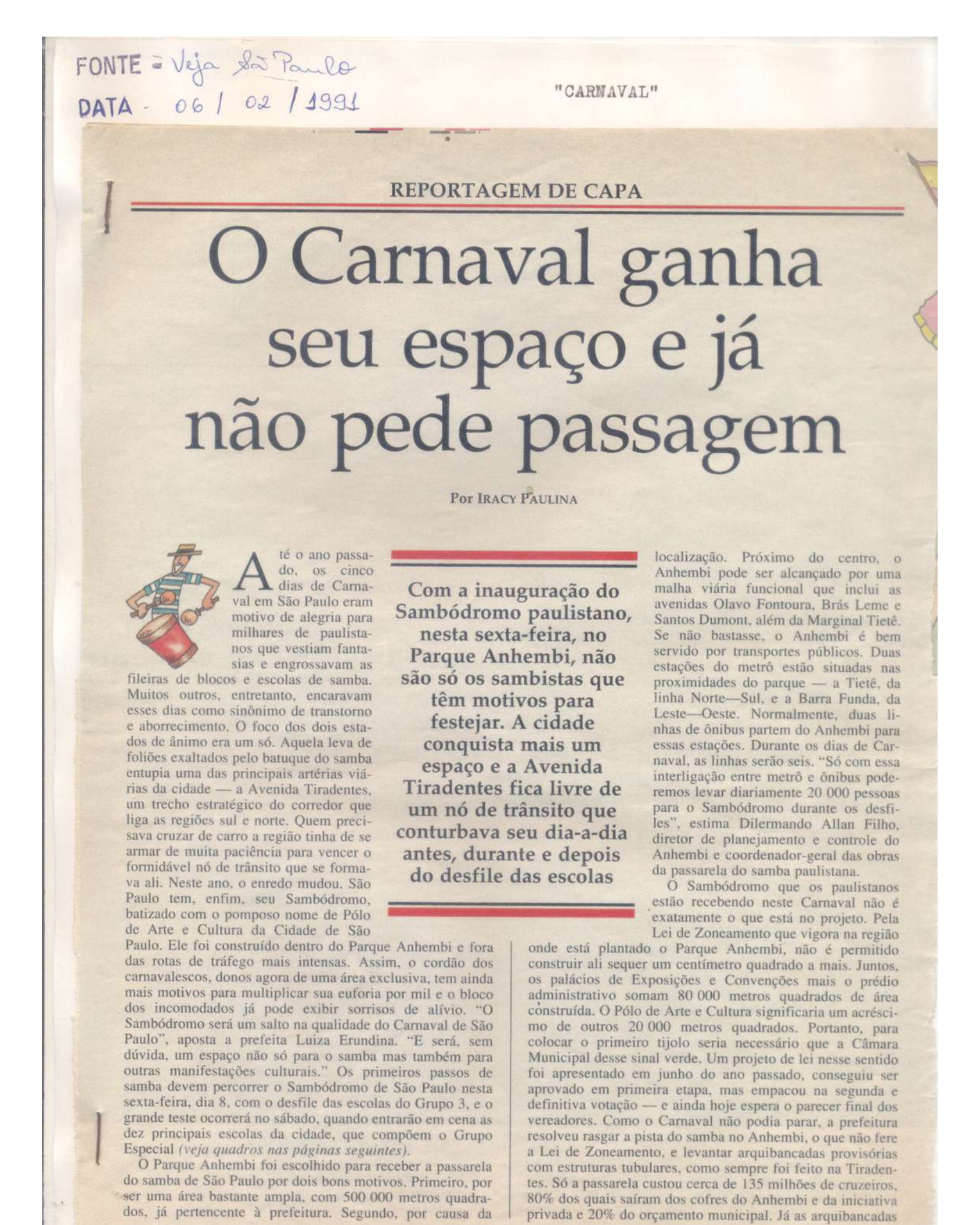 Nossa coleção de recorte de jornais proporciona uma memória dos carnavais com notícias sobre a história do Sambódromo, e os diferentes pontos de vistas dos veículos de comunicação.