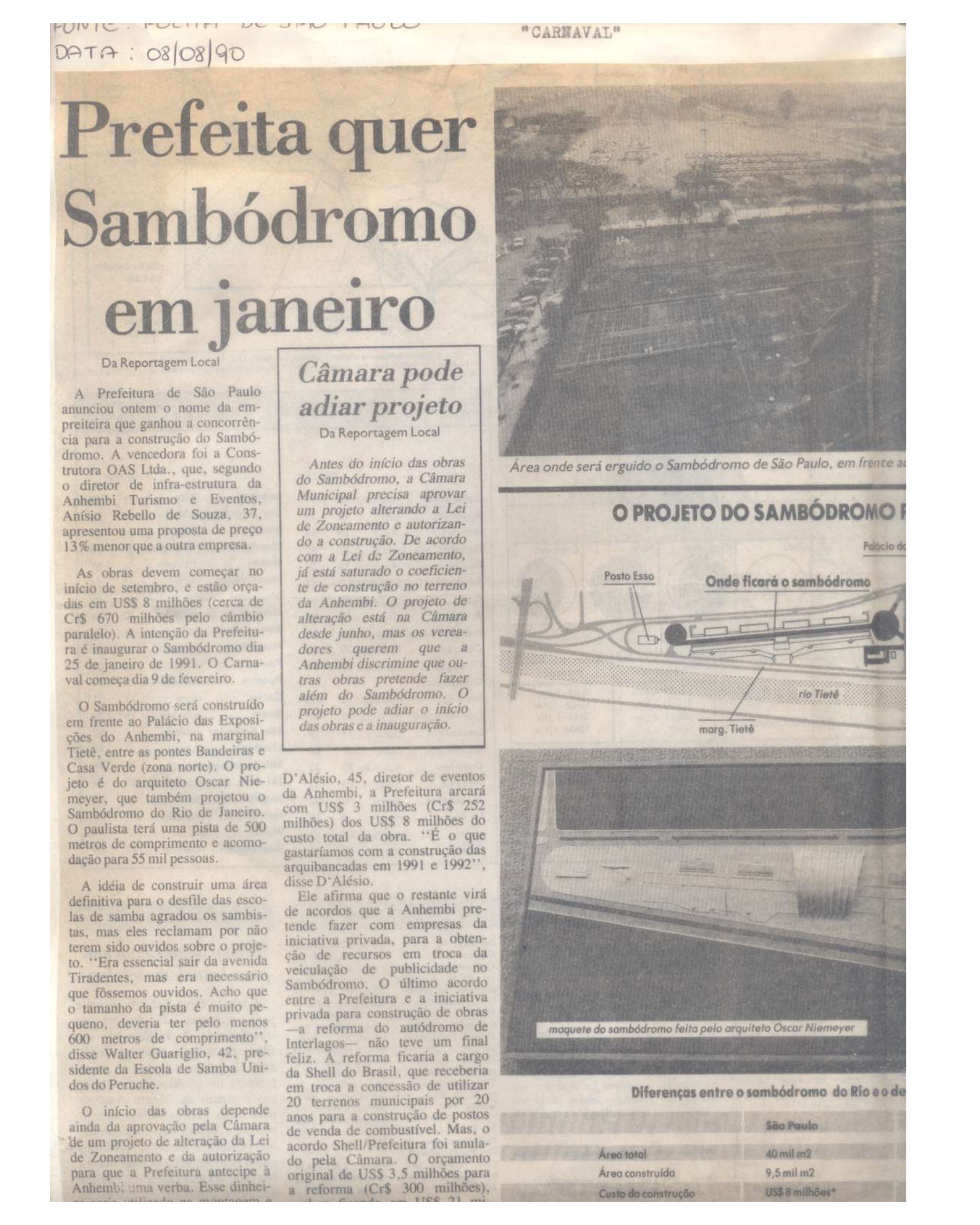 A partir disso veio a esperada fundação do Sambódromo do Anhembi, a construção do Polo Cultural e Esportivo Grande Otelo, feito por Oscar Niemeyer e sua inauguração aconteceu em 1991. Localizado ao lado da Marginal Tietê, o espaço passou por diversas reformas e atualmente possui uma estrutura que comporta os devidos desfiles, sendo uma referência na cidade de São Paulo.