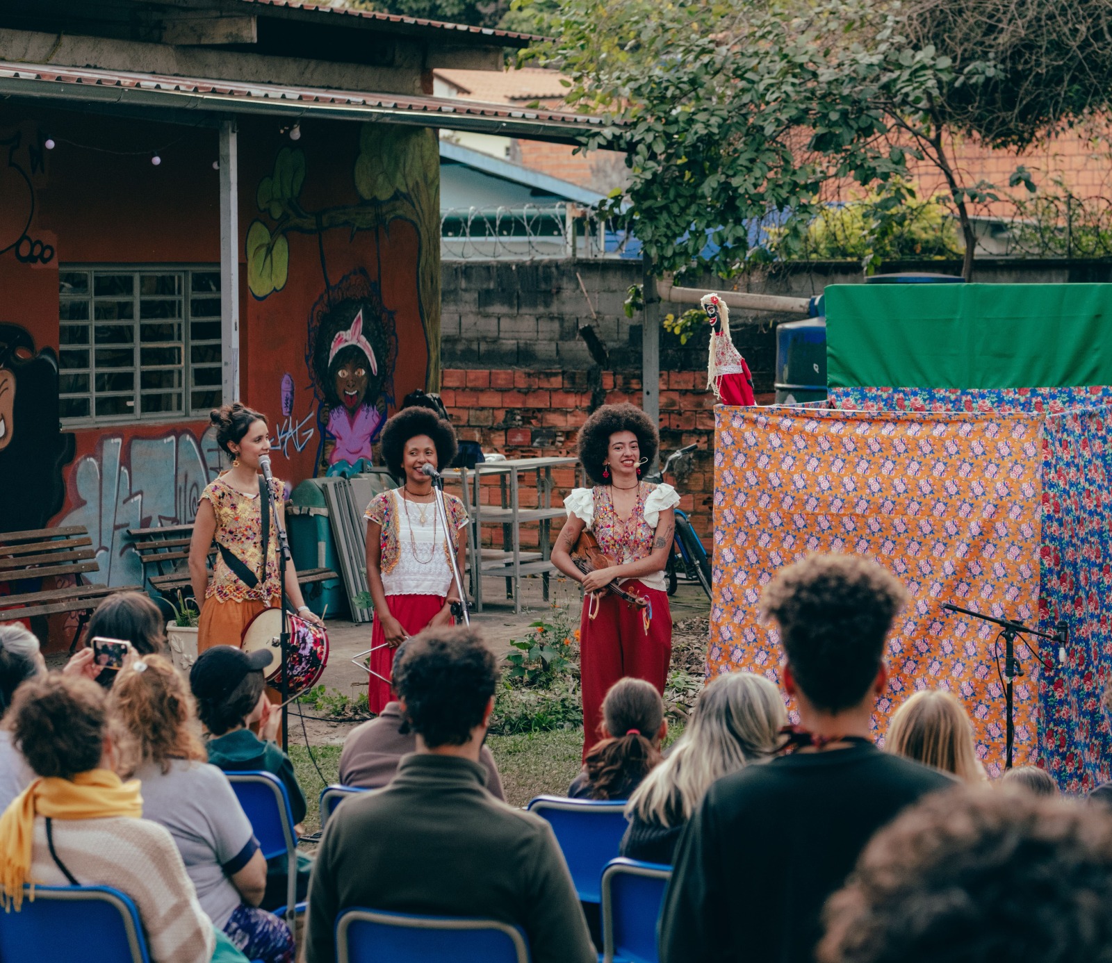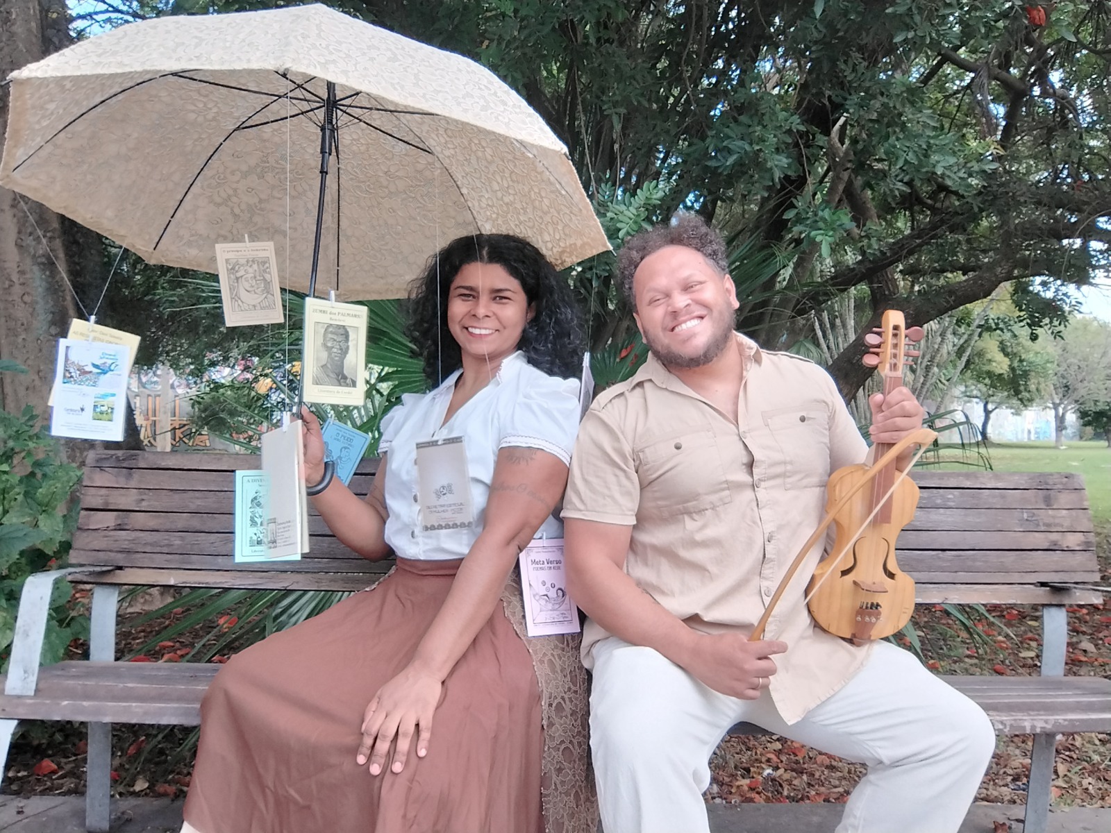 O projeto “Nossas histórias escritas em cordéis”, da Coletiva Trupe Trio apresenta ao público a literatura de cordel impressa e oralizada. Dois caminhantes cantadores e cordelistas, filha e filho de migrantes nordestinos, carregam penduradas em seus guarda-chuvas, histórias em cordéis. Durante todo o trajeto, recitam pequenos trechos de poesia em cordel para o público, convidando-o a acompanhá-los até o local onde as histórias serão contadas. Neste projeto, amparado na literatura e na performance narrativa, as/os artistas rememoram suas infâncias construídas pelas suas ancestralidades negras, indígenas e migrantes. E brincam com sonoridades produzidas pela poesia de cordel, relembrando cantigas, palavras e sotaques que aprenderam com suas mães e pais migrantes nordestinos.