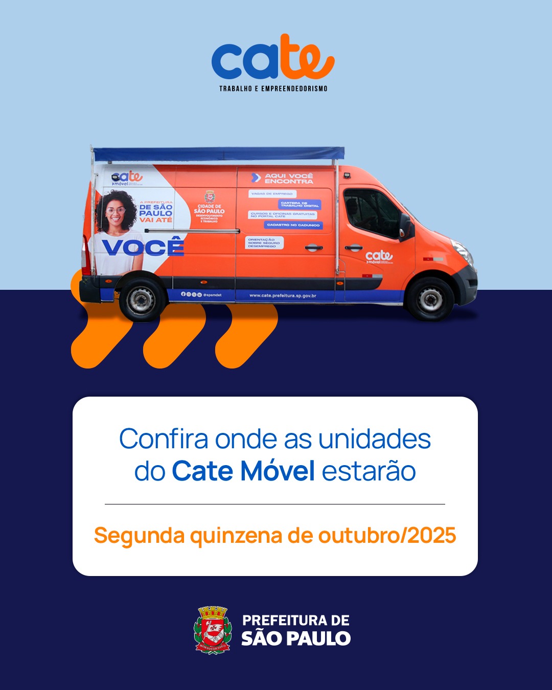 A Prefeitura de São Paulo, por meio da Secretaria de Desenvolvimento Econômico e Trabalho, divulga a programação de apoio à empregabilidade do Cate Móvel durante a segunda quinzena de outubro. A ação contempla bairros de todas as regiões da capital paulista, levando oportunidades de emprego, orientação profissional e apoio ao empreendedorismo.