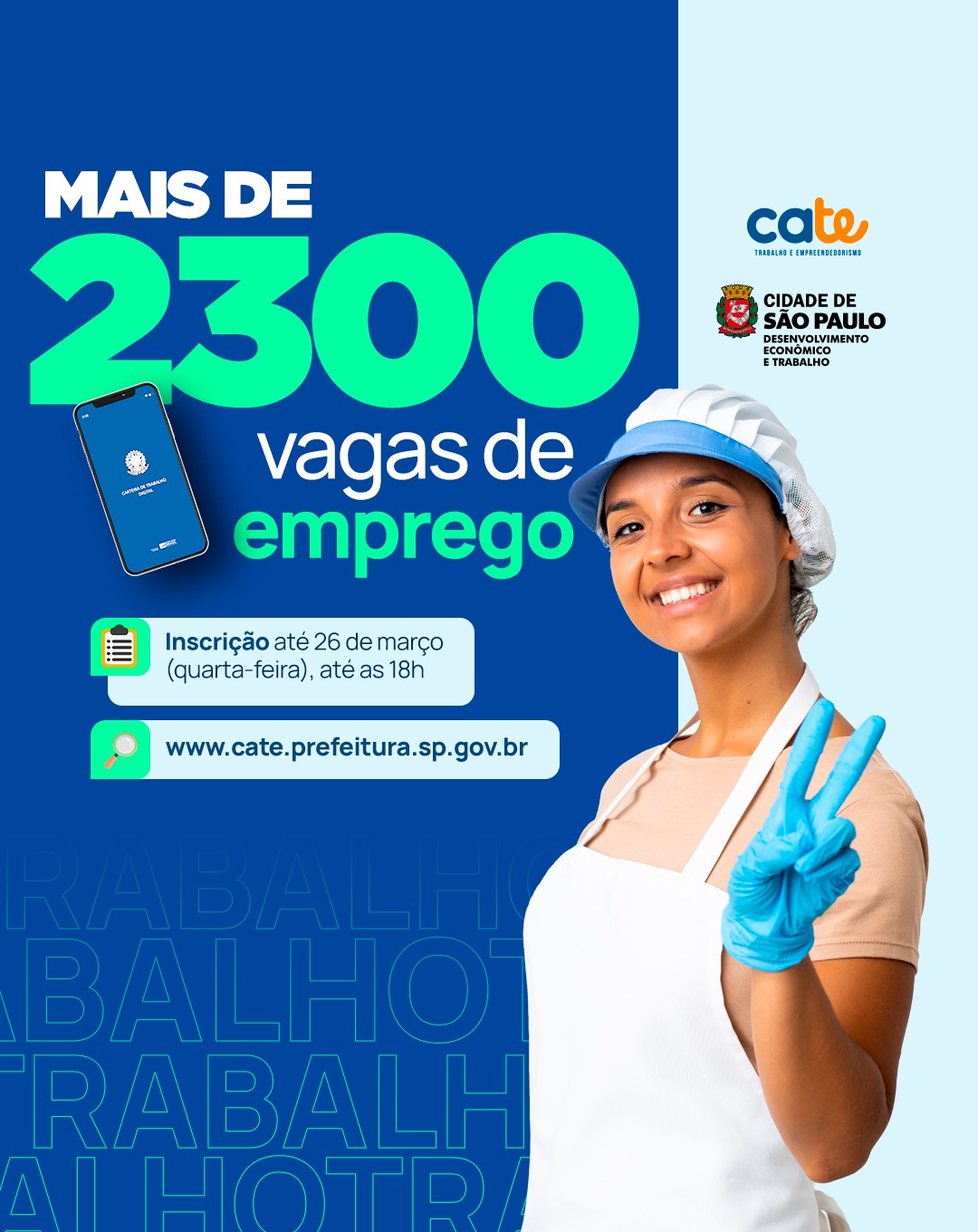A segunda quinzena de março finaliza com mais de 2.300 vagas de emprego aos moradores da cidade de São Paulo, que estão em busca de emprego. As candidaturas podem ser realizadas no Cate - Centro de Apoio ao Trabalho e Empreendedorismo, da Prefeitura de São Paulo, até 26 de março, quarta-feira. Os salários variam entre R$ 1.000 (estágio de operador de telemarketing) e R$ 3.842 (encarregado de obras). As áreas de atuação são comércio, serviços, construção civil, saúde, entre outros. Para se candidatar, basta realizar o cadastro no Portal Cate ou comparecer a uma das 44 unidades da rede, que incluem postos fixos e móveis. No atendimento presencial é necessário apresentar RG, CPF e carteira de trabalho, que pode ser tanto física quanto digital.