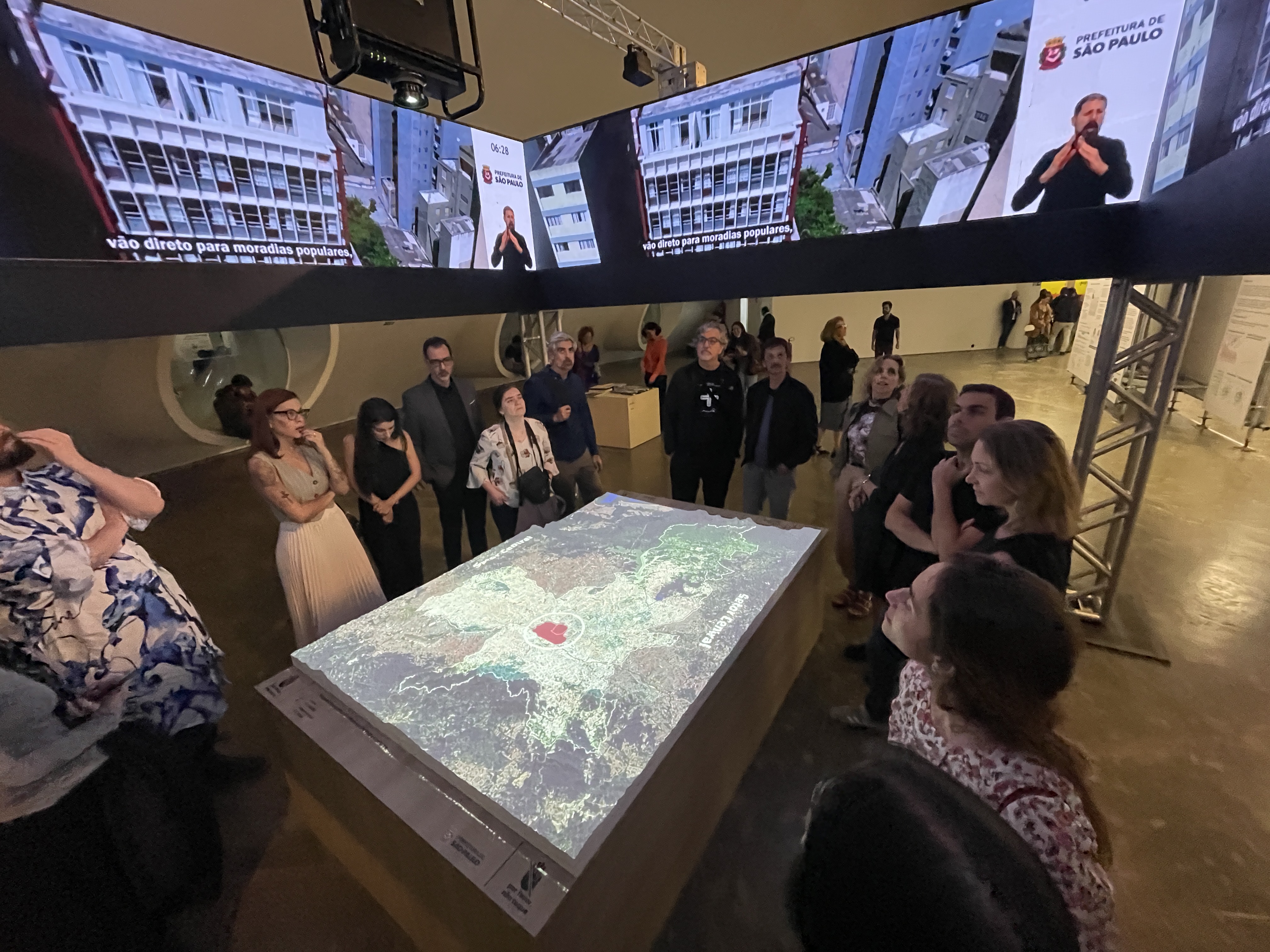 A exposição da Prefeitura reúne em um único espaço imagens, sons e projeções que narram a história e os caminhos da transformação urbana de São Paulo. O público é recebido por uma maquete topográfica da cidade, que ganha vida com projeções mapeadas digitalmente para destacar rios, áreas verdes, centralidades e os principais projetos urbanos. Ao mesmo tempo, um vídeo sincronizado com o mapa exposto conta como a cidade se organiza e se prepara para enfrentar os desafios climáticos e seus projetos.