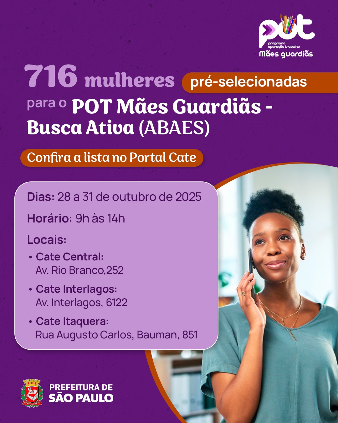 O Programa Operação Trabalho – POT Mães Guardiãs da Prefeitura de São Paulo realiza mais uma convocação de 2025 para novas beneficiárias que irão atuar na rede municipal de ensino, na atividade de busca ativa escolar, iniciativa que visa combater a evasão de alunos. São 716 novas mulheres, em situação de vulnerabilidade social, que se inscreveram no início deste ano e que foram pré-selecionadas para apresentarem a documentação, comprovando os dados fornecidos na inscrição on-line. A lista com os nomes e locais de comparecimento estão no Portal Cate.