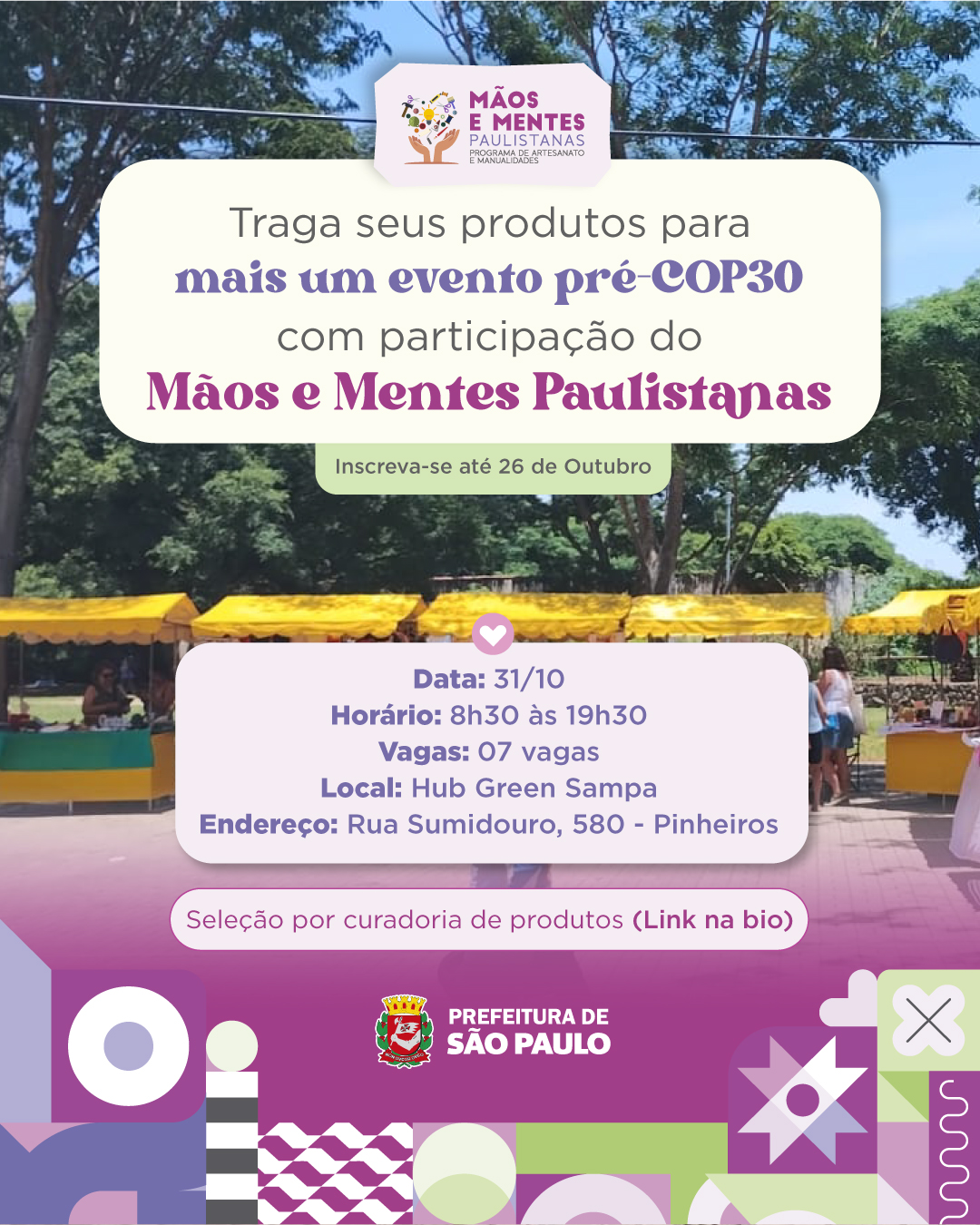 O talento e a criatividade dos empreendedores manuais paulistanos ganharão destaque no evento “Rumo à COP30: Conectando Cidades e Natureza”, que acontece no dia 31 de outubro, no Hub Green Sampa, em Pinheiros. A ação é promovida pela Prefeitura de São Paulo, por meio da Secretaria Municipal de Desenvolvimento Econômico e Trabalho (SMDET), e integra o programa Mãos e Mentes Paulistanas, que fomenta o artesanato e as manualidades na capital, oferecendo credenciamento, qualificação e oportunidades de comercialização aos empreendedores do setor. As inscrições podem ser feitas até 26 de outubro pelo link