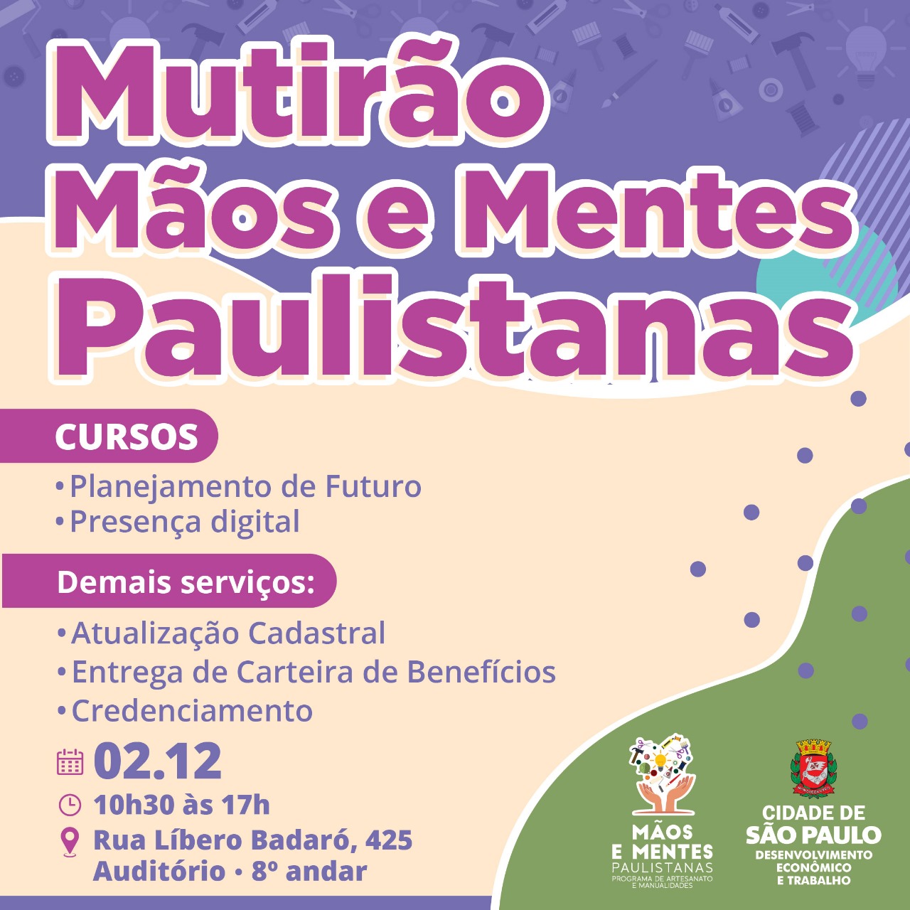 A Prefeitura de São Paulo oferece nesta semana os cursos livres de “Planejamento de Futuro” e “Presença Digital”, que fazem parte da qualificação empreendedora para artesãos e manualistas da Capital. Os cursos são parte do Mãos e Mentes Paulistanas, iniciativa da Secretaria Municipal de Desenvolvimento Econômico e Trabalho, que atua no desenvolvimento do setor de artesanato e manualidades, promovendo acesso ao mercado e capacitação profissional.