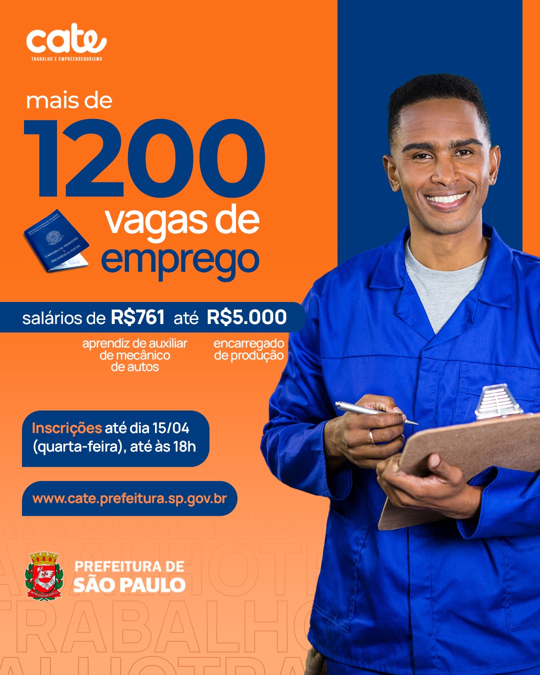 O Cate - Centro de Apoio ao Trabalho e Empreendedorismo, da Prefeitura de São Paulo, conta nesta semana com mais de 1.200 vagas de emprego em diversos setores como comércio, serviços, construção civil, saúde, entre outros. Os salários variam de acordo com os cargos, indo de R$761 (aprendiz de auxiliar de mecânico de autos) a R$5.000 (encarregado de produção).