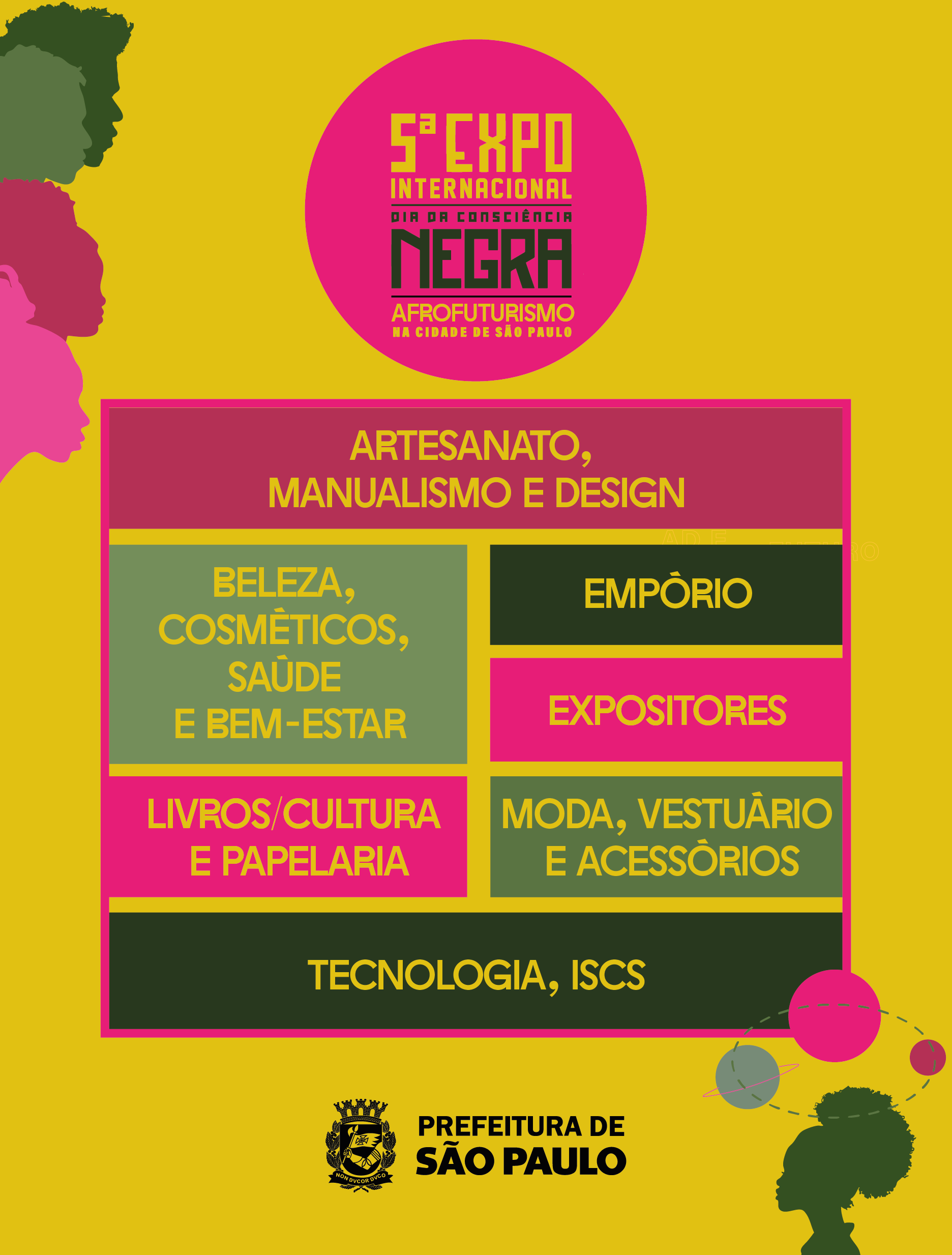 A 5ª Expo Internacional Dia da Consciência Negra 2025 conta com 77 afroempreendedores selecionados por meio de edital, em ação conjunta da Secretaria Municipal de Direitos Humanos e Cidadania (SMDHC) e da Secretaria Municipal de Desenvolvimento Econômico e Trabalho (SMDET). Distribuídos pela rampa de acesso ao metrô, pelo anexo da Sala Adoniran Barbosa e pelo corredor da Biblioteca do Centro Cultural São Paulo (CCSP).