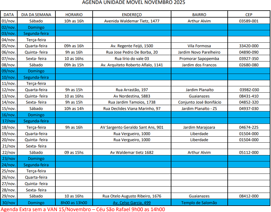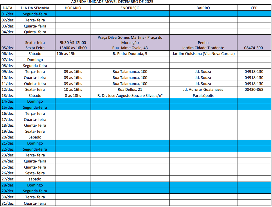 Agenda da Van - Unidade Móvel Dezembro 2025