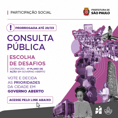 A Consulta Pública representa um momento de priorização. A partir da escolha popular, serão definidos quais serão os desafios prioritários para serem solucionados na Cidade a partir da ótica do Governo Aberto.