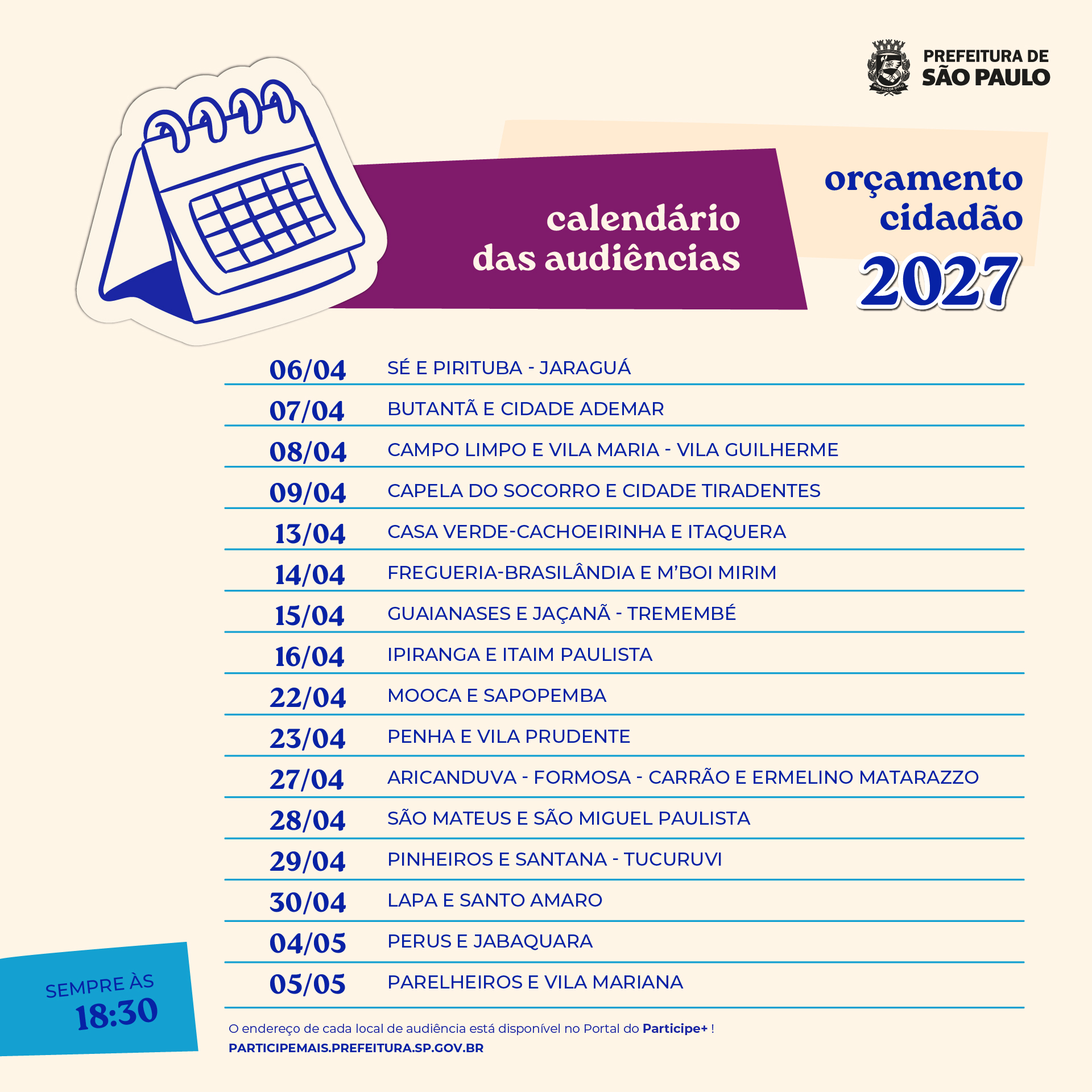As audiências públicas do Orçamento Cidadão 2027 ocorrem nas 32 Subprefeituras de 6/04 a 5/05, com o intuito de viabilizar a participação da sociedade civil no processo de elaboração do orçamento e planejamento municipais e, assim, adequá-lo às suas demandas. Além disso, atendem também a dispositivos legais previstos no ordenamento jurídico, em especial a Lei Orgânica do Município de São Paulo e a Lei de Responsabilidade Fiscal. Saiba mais sobre o Orçamento Cidadão 2027 nesta página da Secretaria Municipal de Planejamento e Eficiência (SEPLAN).