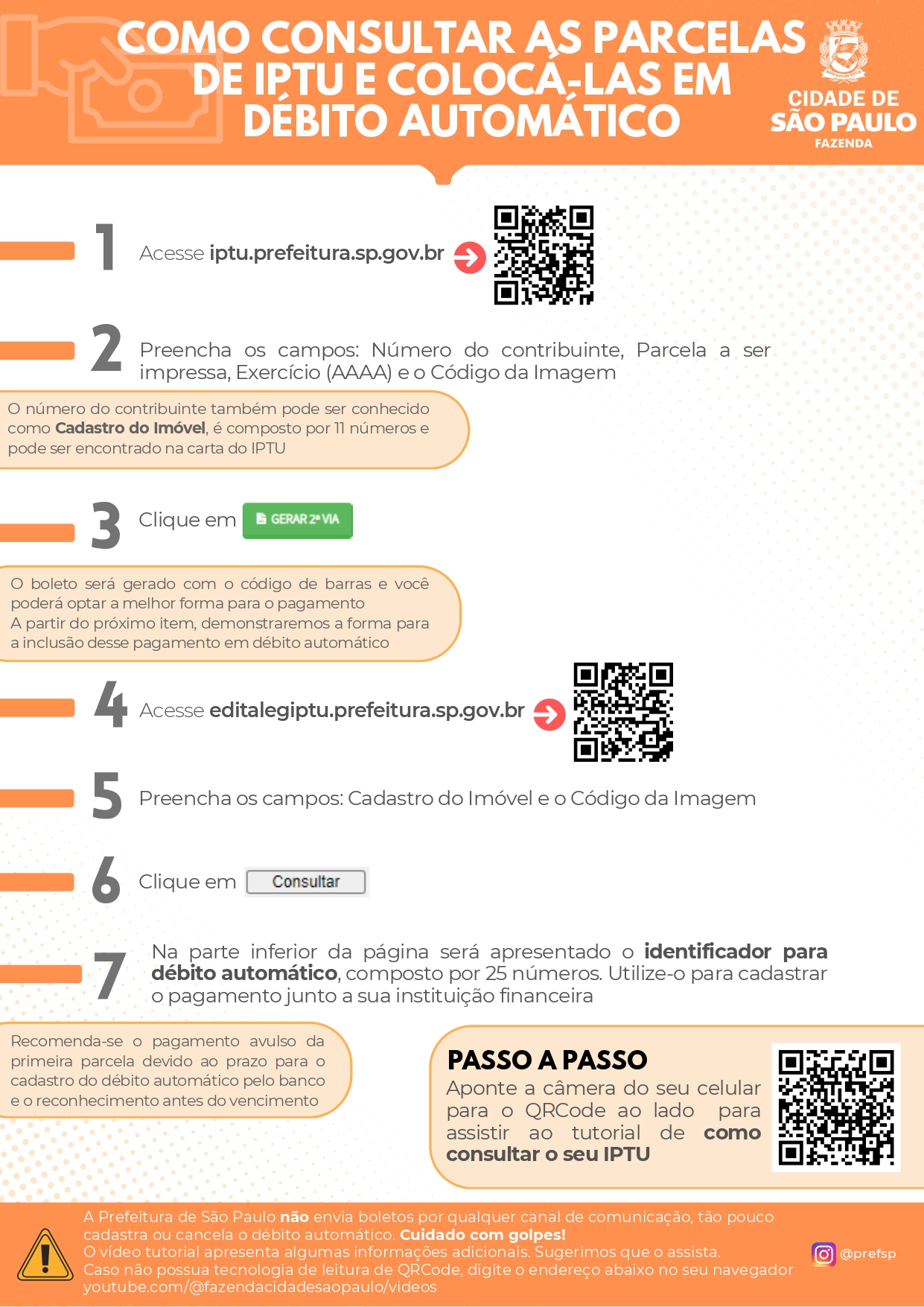 1) obtenha a 2ª via do boleto no site da Prefeitura, ou utilize os caixas de autoatendimento, informando o cadastro do imóvel;