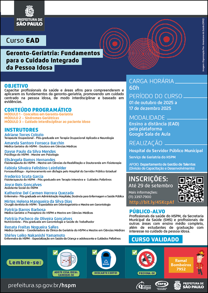 Público-alvo: Todos os profissionais que atuam no HSPM e na Secretaria Municipal da Saúde (SMS) são convidados a se inscreverem, além de estudantes de graduação com interesse no cuidado da pessoa idosa.