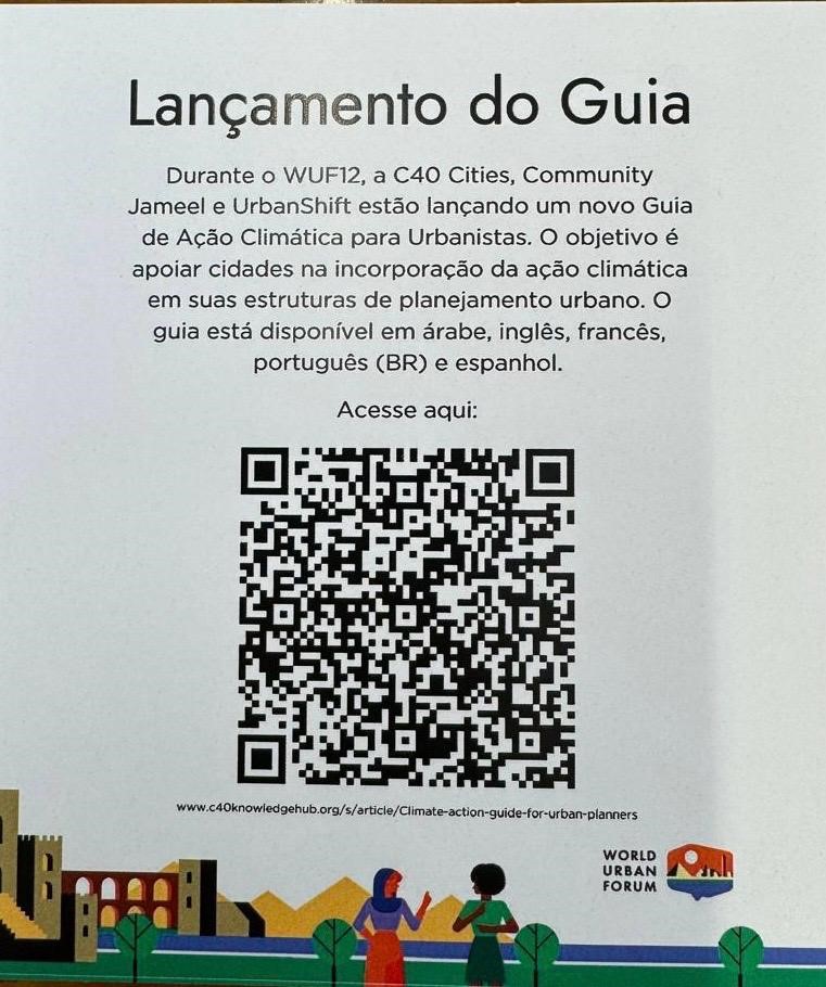 Durante o World Urban Forum (WUF12, realizado na primeira semana de novembro de 2024, no Cairo, principal conferência global sobre urbanismo sustentável, foi lançado pela C40 Cities, em parceria com as instituições Community Jamel e Urbanshift, o “Guia de Ação Climática para Urbanistas.