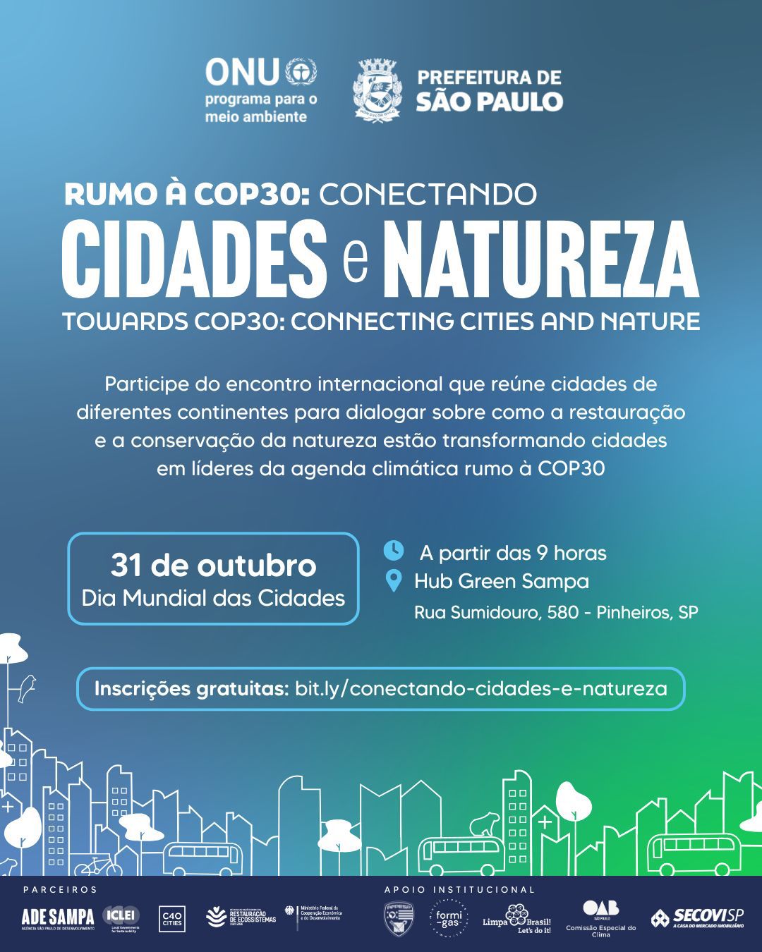 A Prefeitura de São Paulo, em parceria com o Programa das Nações Unidas para o Meio Ambiente (PNUMA), realiza nesta sexta-feira (31) o Workshop Internacional “Rumo à COP30: Conectando Cidades e Natureza”, uma iniciativa de destaque entre os eventos pré-COP30 promovidos por governos locais no mundo. A iniciativa celebra o Dia Mundial das Cidades e integra o encerramento do Projeto Geração Restauração, marco global de cooperação para ações de restauração da natureza e enfrentamento da crise climática. Os interessados podem se inscrever gratuitamente no link.