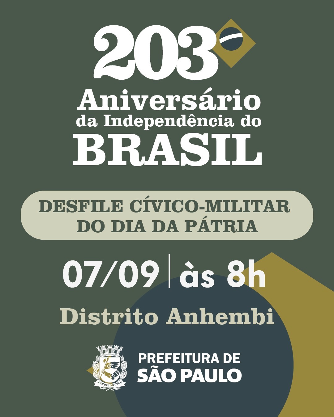 No dia 7 de Setembro, o Brasil chega ao marco de 203 anos de independência, e para comemorar a Prefeitura de São Paulo, em parceria com a São Paulo Turismo e apoio do Governo do Estado, Marinha do Brasil, Exército Brasileiro, Força Aérea Brasileira, forças de segurança estadual e municipal e entidades civis, realizará o tradicional desfile Cívico-Militar, no Sambódromo do Anhembi.