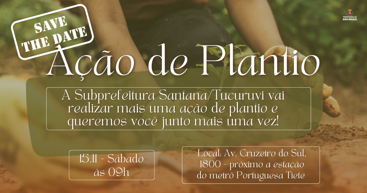 A Subprefeitura Santana-Tucuruvi, em parceria com a Secretaria Municipal das Subprefeituras, convida a população para participar da ação de plantio de árvores que será realizada neste sábado, 15 de novembro, às 9h, na Avenida Cruzeiro do Sul, 1800, próximo à Estação Portuguesa-Tietê.