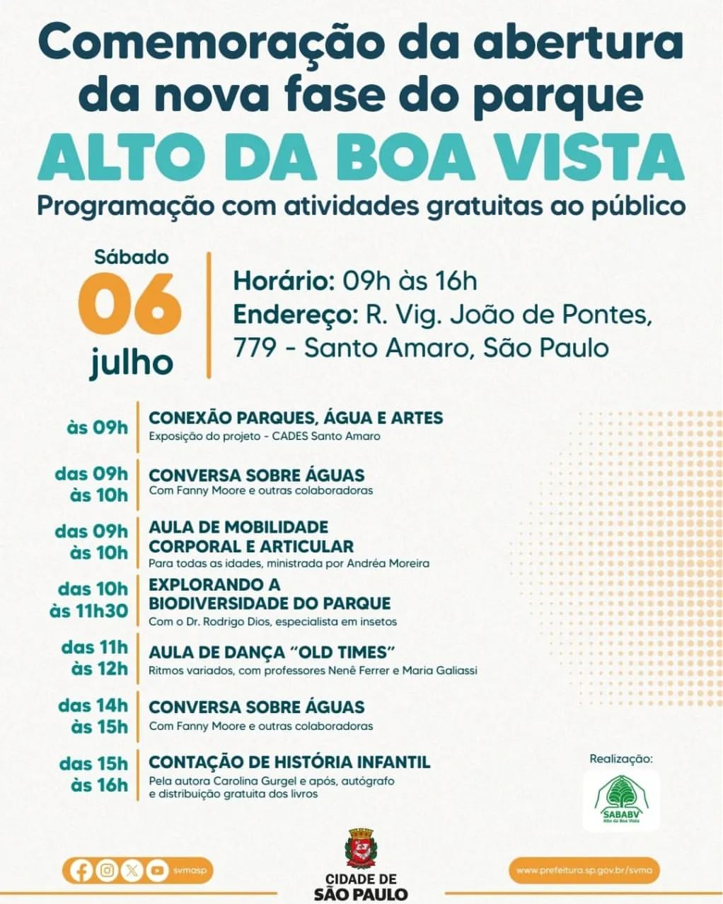 No próximo sábado, 6 de julho, acontecerá a comemoração da abertura da nova fase do Parque Alto da Boa Vista, localizado na Rua Vigário João de Pontes, nº 779 - Santo Amaro. No dia, haverá atividades gratuitas para o público, com aulas diversas e contação de histórias.