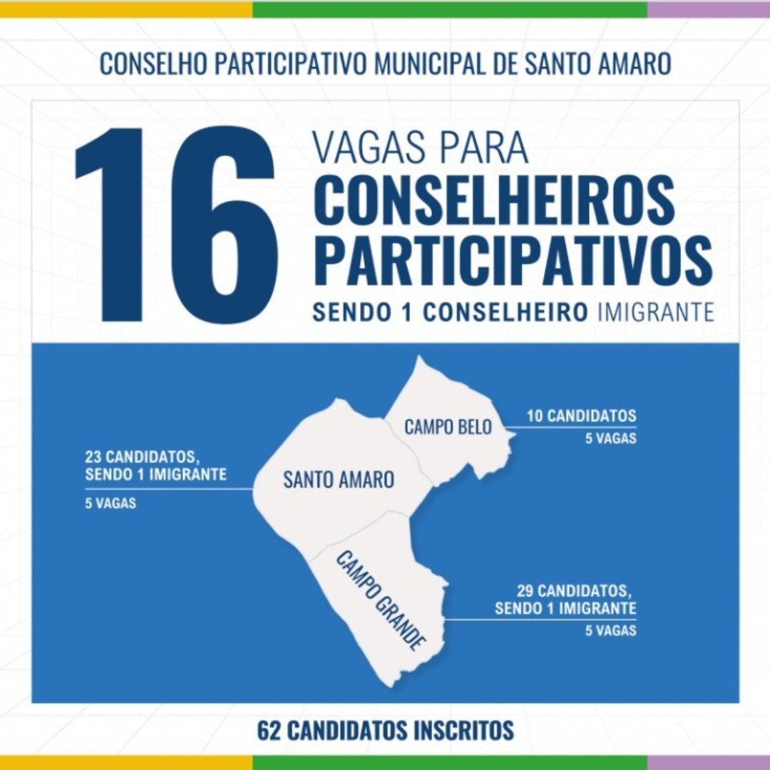 Para o Conselho Participativo Municipal de Santo Amaro, são 16 vagas, sendo que, ao todo, a região recebeu 62 candidatos inscritos dos distritos de Santo Amaro, Campo Belo e Campo Grande.