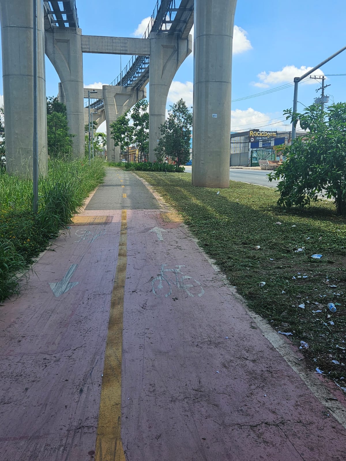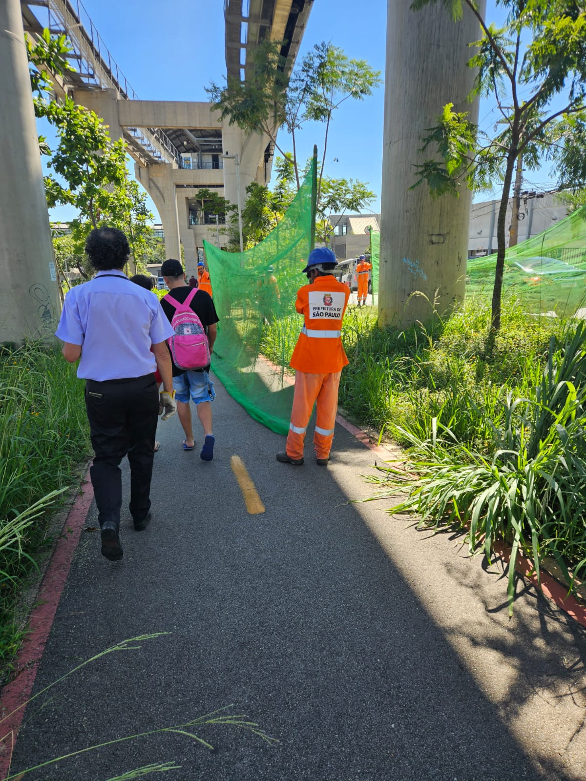 Nesta segunda, o trabalho de corte de grama e limpeza segue pela Avenida Ragueb Chohfi, incluindo a retirada das escoras de árvores embaixo do monotrilho. Essas grades de madeira serviram para ajudar a segurar as mudas, até que enraizassem no solo, quando foram plantadas.