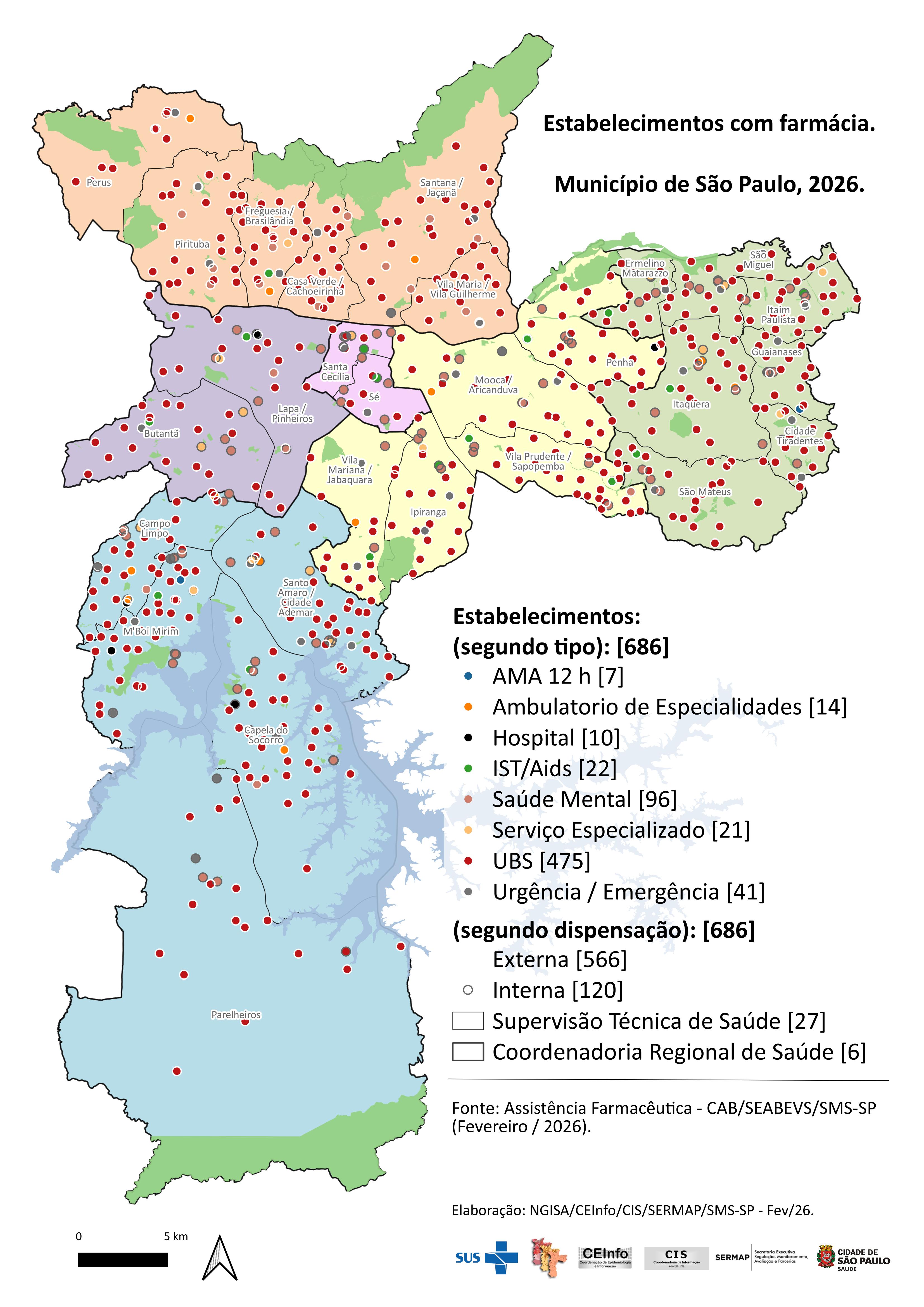 Neste quadro é apresentada a distribuição das farmácias por Coordenadoria Regional de Saúde (CRS) e Supervisão Técnica de Saúde (STS) no município, que somam 686 estabelecimentos de saúde com farmácia.