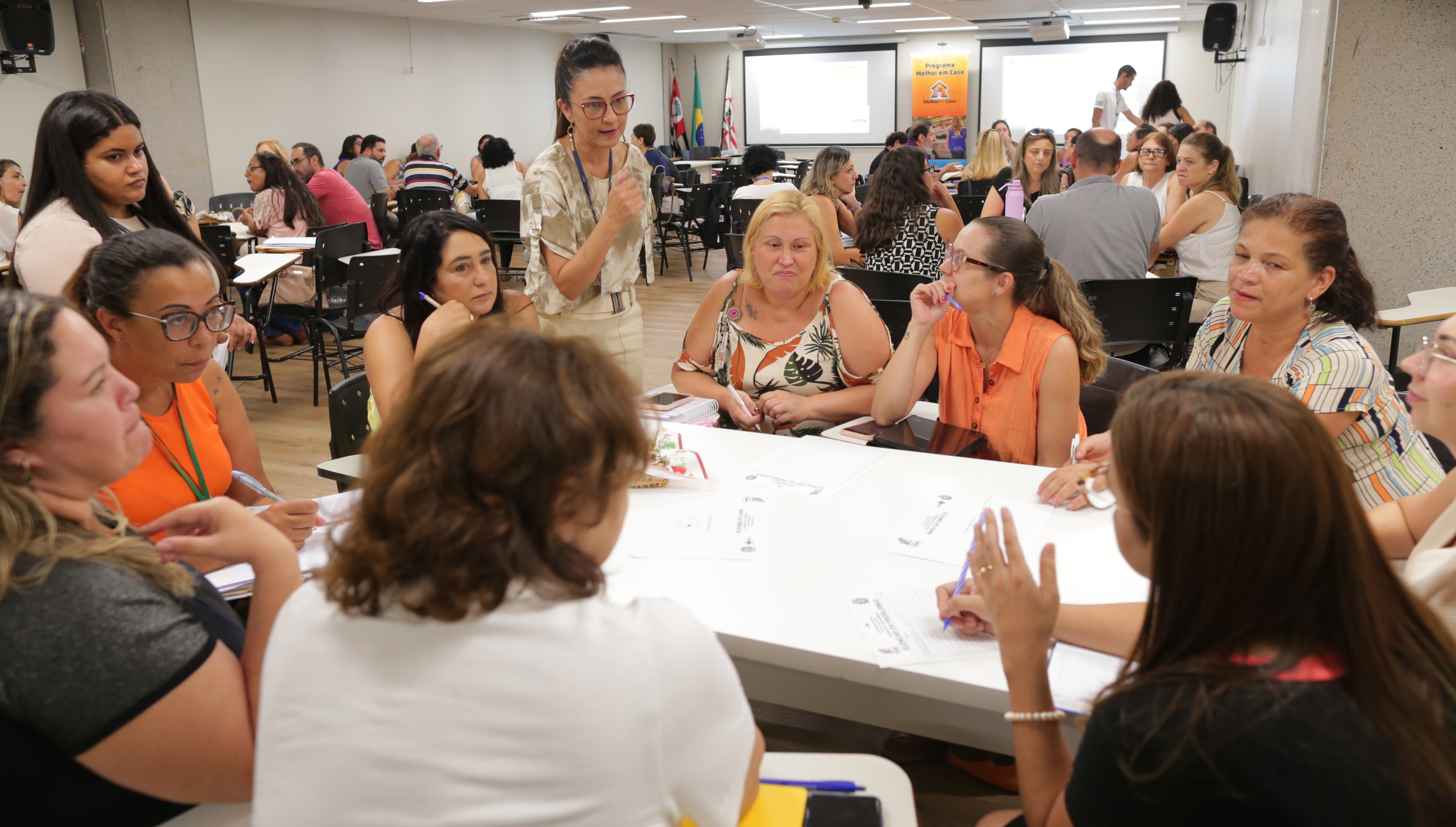 Karina Dib (de pé, ao centro) em evento com equipes do Programa Melhor em Casa (Acervo/SMS)