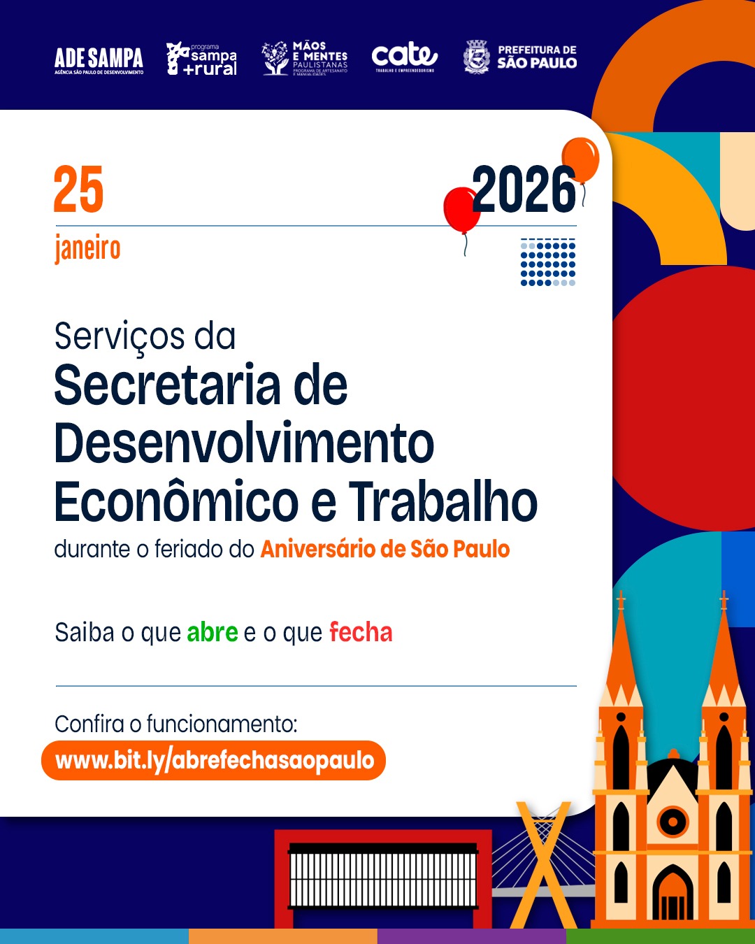 O Cate - Centro de Apoio ao Trabalho e Empreendedorismo da Prefeitura de São Paulo realiza no dia 21 de janeiro o Contrata SP – Aniversário da Cidade. O mutirão de empregabilidade oferecerá mais de 2500 vagas para diversas áreas. Para participar, é necessário se inscrever até o dia 20 pelo Portal Cate, e comparecer com RG, CPF e carteira de trabalho (física ou digital) ao Cate Central, na Avenida Rio Branco, 252, das 9h às 16h.
