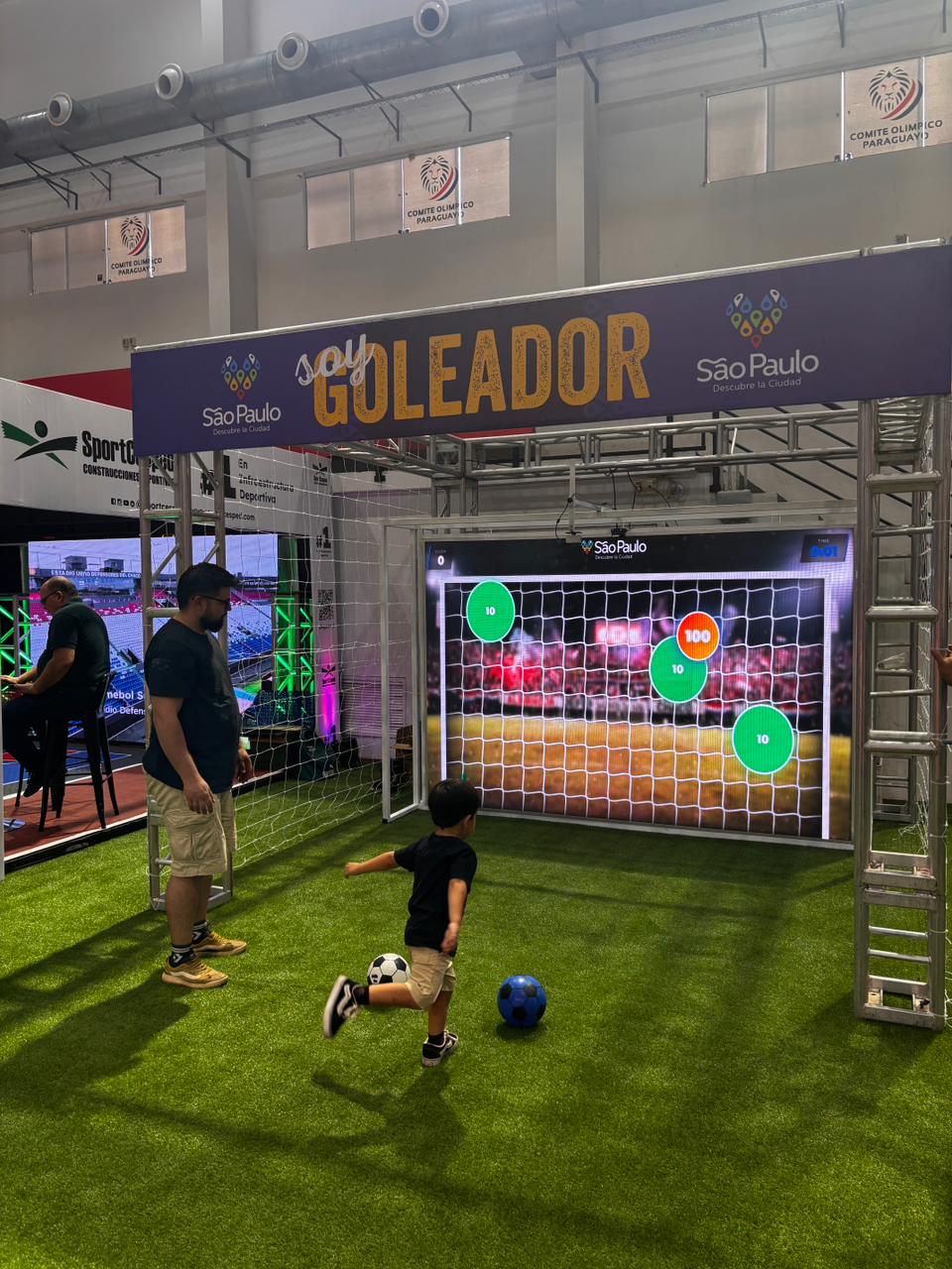 Entre as ativações apresentadas pela cidade de São Paulo está o simulador de gols, em que o participante ganha pontuações diversas a partir do tipo de chute.
