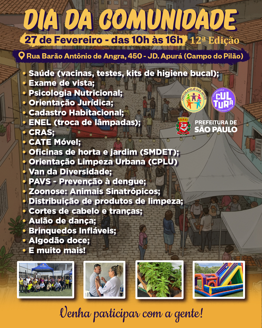 A Prefeitura de São Paulo, por meio da Subprefeitura Cidade Ademar, promove mais uma edição do Dia da Comunidade, uma grande ação social itinerante que leva serviços públicos, atividades culturais e lazer diretamente aos moradores da Cidade Ademar e Pedreira. A edição de dezembro precisou ser adiada, devido ao mau tempo, sendo remarcada para próxima sexta-feira, dia 27 de fevereiro, na Rua Barão Antônio de Angra, 450, no Jardim Apura. A programação foi estruturada para garantir serviços práticos e de qualidade. Na área da saúde, serão oferecidas vacinas, testes rápidos, nutricionista, orientações de prevenção e exame de vista gratuito, além da distribuição de kits de higiene bucal.