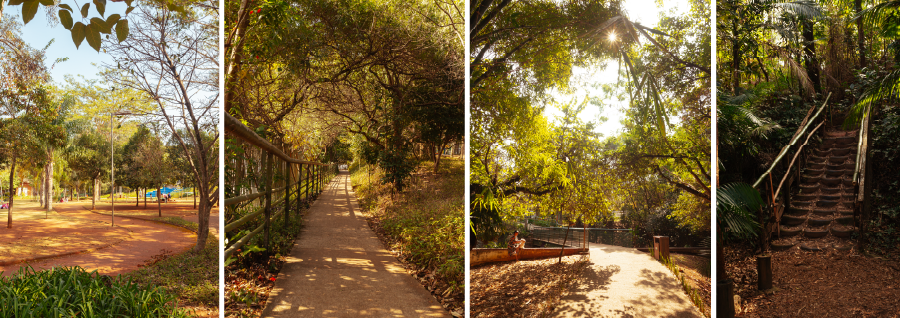 Pistas de caminhada e de ciclismo infantil, aparelhos de ginástica, playground, paraciclos, quadra poliesportiva, pista de skate, espelho d’água, sanitários e praça. Possui trilhas monitoradas, que devem ser agendadas com antecedência para grupos de até 5 pessoas. Segundo o Regulamento de Uso do Parque, os cães são permitidos apenas na área da antiga Praça Martin Luther King, desde que conduzidos com coleira e guia.
